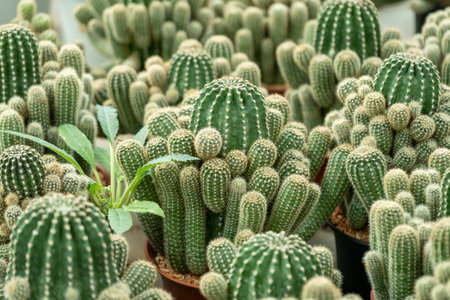 Collection beautiful prickly cacti in the greenhouse. Background