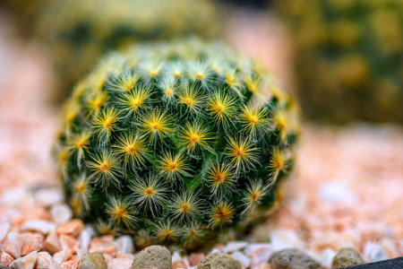 Mammillaria cactus, succulents plants with round shapes, and yellow thorns in the rock garden.