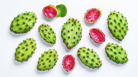 Bright and fresh opuntia fruits with vibrant green skin arranged on a white backdrop, showcasing their unique texture and color for culinary inspiration.