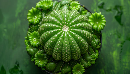 Top view of a group of vibrant green cacti with white patterns