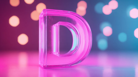 This image showcases a pink acrylic letter D on a glossy surface, surrounded by a dreamy bokeh background, ideal for creative design and artistic projects.