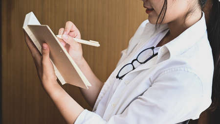 Woman hand writing down in small white memo notebook for take a note not to forget or to do list plan for future.