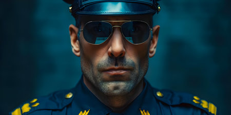 A male police officer in uniform and sunglasses for crime concepts. Concept Crime prevention, law enforcement, police officer, detective, uniform, sunglasses