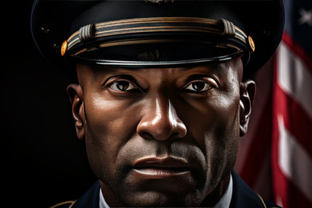 Close up unrecognizable serious African American mature bearded male man guy marine sailor elegant suit uniform plain gray background. Captain cruise ship pilot navigation safe transportation flying