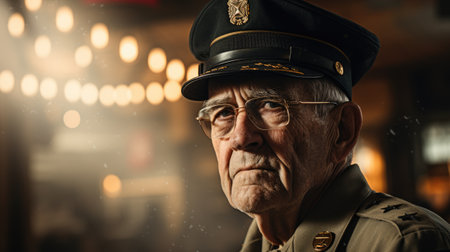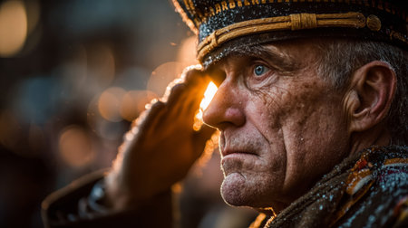 Close-up portrait of a respectful senior veteran saluting with a snowy military cap, under a warm sunset light