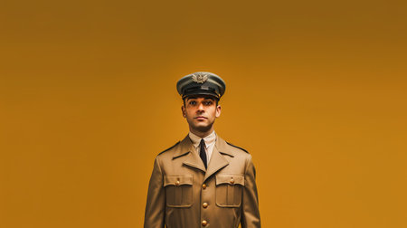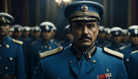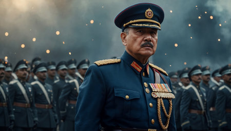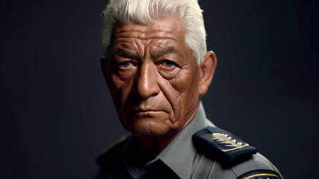 Confident senior retired military general in traditional uniform gazes directly into the camera.