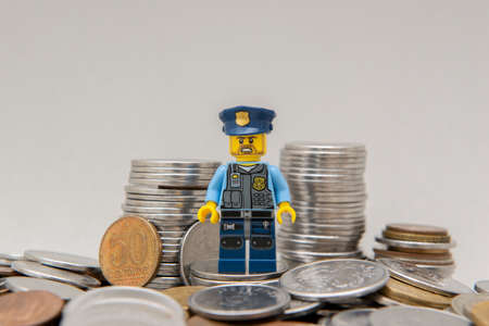Florianopolis, Brazil, March 28, 2020: Minifigure of policeman on a pile of coins. The true hero deserved greater recognition for his bravery. Lego minifigures are manufactured by The Lego Group.