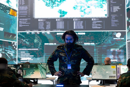A soldier observes multiple screens showing surveillance data and mission footage in a command center.