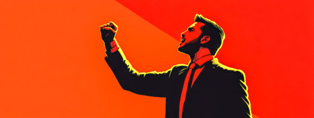 Energetic speaker raising voice and fist in a protest