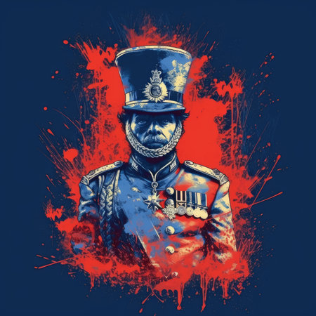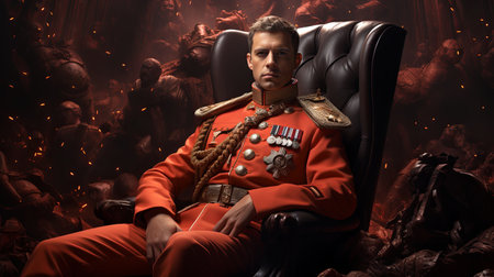 An abstract general of the imperial army wearing a red uniform is seen sitting in a black chair