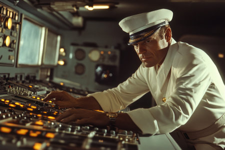 Male cruise ship captain inspecting the ship's controls in the command room, focused on ensuring smooth operation