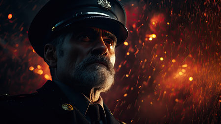 Portrait of a senior policeman in a hat with a white beard on fire background