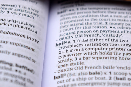 English Definition Dictionary Page Of Printed Word - Bail Close Up Image