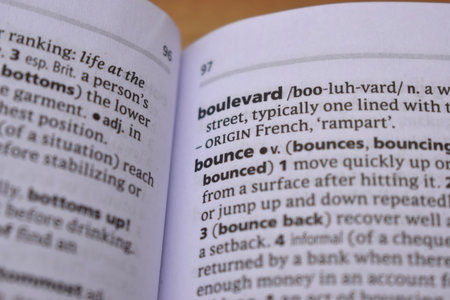English Definition Dictionary Page Close Up Of Printed Word Of -Bounce