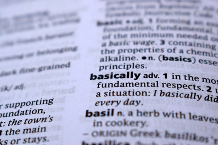 English Definition Dictionary Page Close Up Of Printed Word Of -basically