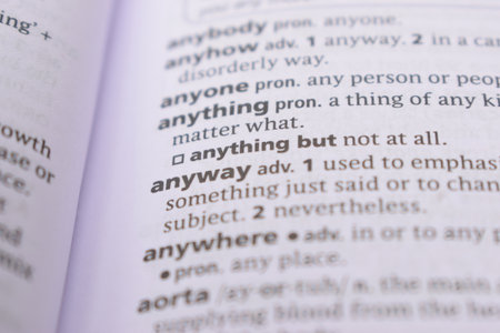 English Definition Dictionary Page Close Up Of Printed Word Of -anyway