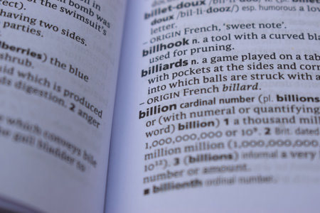 English Definition Dictionary Page Close Up Of Printed Word Of -billion
