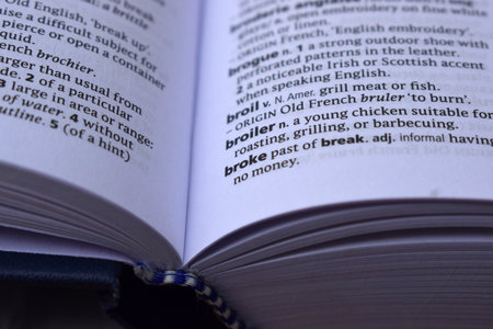 Close Up Of English Definition Dictionary Printed Page Word Of - broke