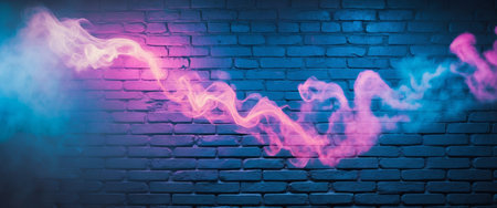 AI Generated. Brick wall illuminated by blue and pink neon lights with smoke