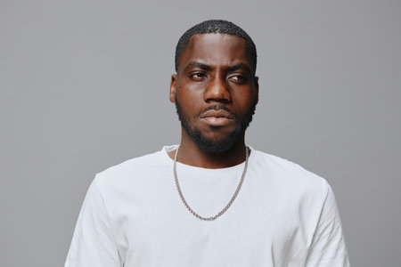 Portrait of a thoughtful young man with a serious expression, wearing a simple white t shirt and a silver chain, set against a neutral gray background