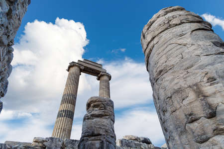 View of Apollon Temple in Didyma Ancient City in Ayd?n Turkey, on cloudy blue sky bakcground.
