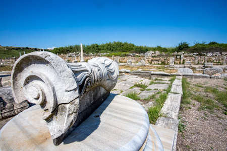 View of Didyma Ancient City in Ayd?n, Turkey, with granit columns and temple, on blue sky background.