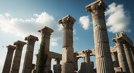 Stunning view of towering ancient columns reaching towards a bright blue sky. This impressive architectural feature captures the essence of timeless history and artistry.