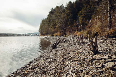 stone lake shore, cold autumn weather on the lake, water, forest on the horizon, autumn landscape