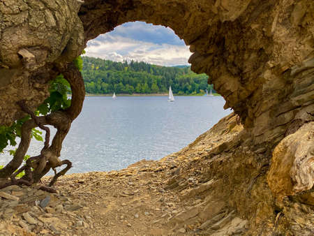 View of the Lake Edersee with sailing boats, a tree, blue sky and clouds, in Hesse, Germany