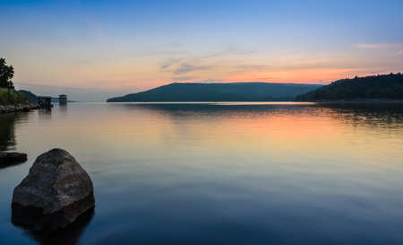Beautiful sunset over the lake. Colorful summer landscape with lake and sky.