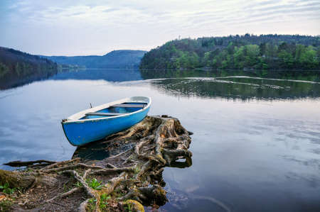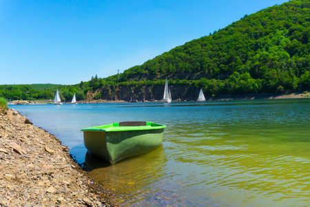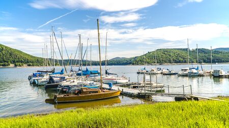 Sandy beach and small boat harbor of the Biggetalsperre (Bigge lake), Sauerland, North Rhine-Westphalia, Germany