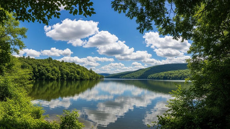Capture the tranquil beauty of a river landscape surrounded by lush green forests, reflecting a clear blue sky and vibrant nature in calm water.