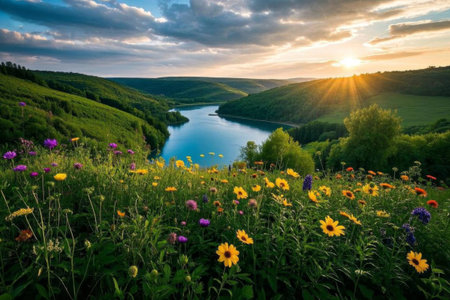 Gorgeous sunrise idyllic scenery, tranquil lakeside sea of flowers morning light
