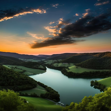 Generative AI Image of Tranquil Empty Lake River with Mountain Hill View at Sunset Sunrise Sky