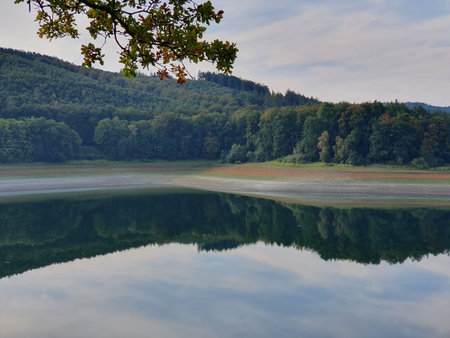 white clouds reflecting in the blue water of Crescent lake and forest-covered hill in the Morvan in France