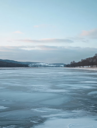 A tranquil winter landscape shows a frozen river stretching toward distant hills under a soft twilight sky. The icy surface reflects muted colors creating a serene atmosphere.