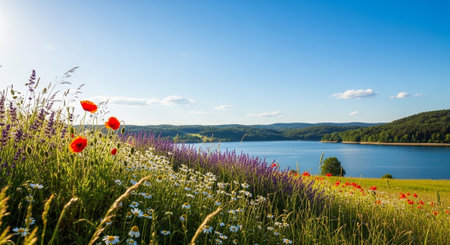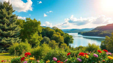 A scenic landscape showcases a calm lake surrounded by verdant vegetation and bright orange flowers. The composition features a clear blue sky, suggesting a bright day. The image uses natural lighting and offers ample copy space, suitable for various commercial and editorial applications.