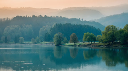 Lake Bled in Slovenia at sunrise. Landscape with lake and forest.