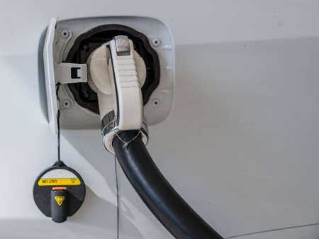 Close-up hand grip plug of industrial electric charging machine connected with socket charge on white electric car for rechargeable battery, zero emission vehicle and green energy for smart life