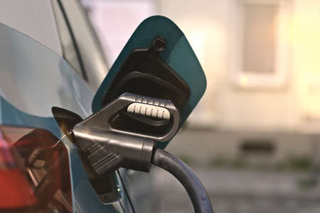 plug of the charging cable plugged into an electric car, charging an electric car at the station