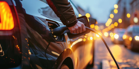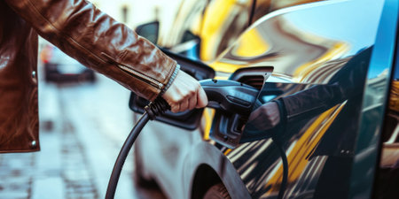 Man holding an attached charger on the Electric Vehicle in focus. High quality photo. Charging EV car. Carbon free. Future technology. Zero emmision electric car. Fast AC 42w EV charger.