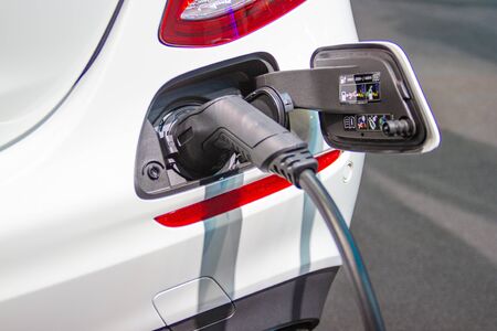 Close-up of an electric car being charged. Horizontal image with copy space.
