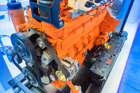 Harvester or tractor engine, new modern technology combine vehicle motor with metal, plastic parts, drive belts, heavy agricultural industry equipment.