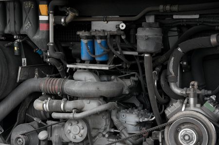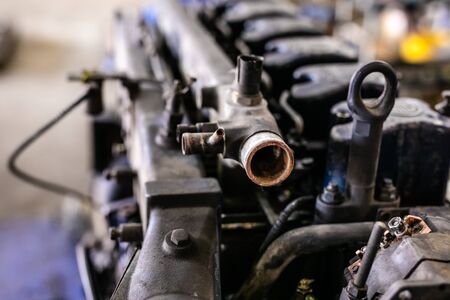 Engine parts of the old havy truck with rusty pipes. Tlorry motor compartment, tractor motor, internal part of auto. Special car service concept