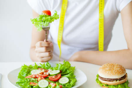 Asian women are choose food between delicious food with healthy food. Woman choosing between fried chicken and vegetable salad.