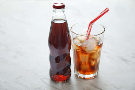 Full glass of cola with ice and curve straw, bubble and fizzy texture, isolated on white background.