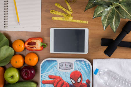 top view, digital tablet on a wooden table, fitness and weight loss concept, dumbbells, white scale, towels, fruit, Weight loss