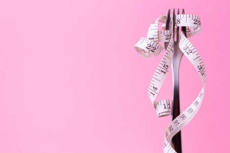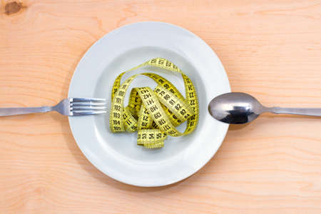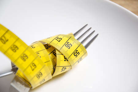 Woman trying to eat tape measure. Close up photo of tape measure on a plate and on a fork. Overhead view