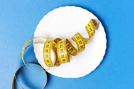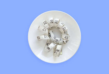 White measuring tape in a white round plate on a blue background