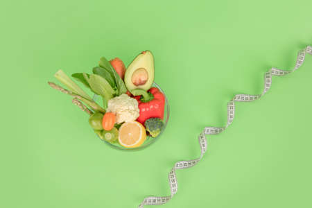 fresh vegetables, measuring tape on wooden background